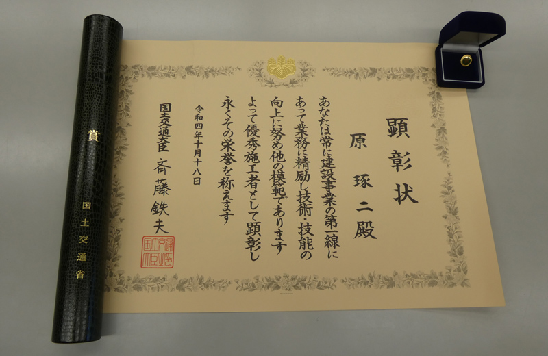 令和4年10月18日、当社 工事部 原 琢二 が優秀施工者国土交通大臣顕彰(建設マスター)を賜りました。